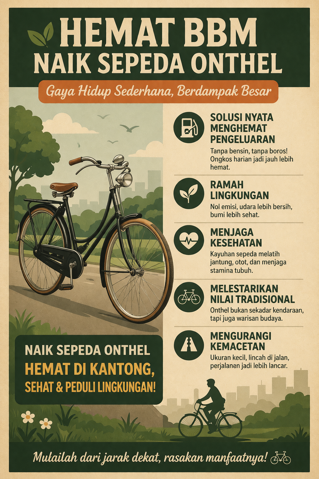 Naik sepeda onthel bukan hanya tentang nostalgia, tetapi juga solusi cerdas menghadapi kenaikan BBM. Dengan manfaat ekonomi, kesehatan, dan lingkungan yang ditawarkan, sepeda onthel layak menjadi pilihan transportasi sehari-hari. Perubahan kecil seperti ini, jika dilakukan bersama-sama, dapat memberikan dampak besar bagi kehidupan kita dan masa depan bumi.